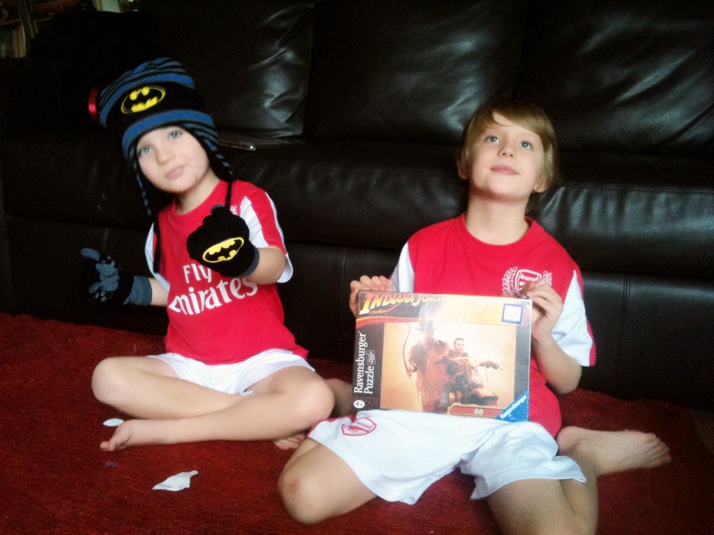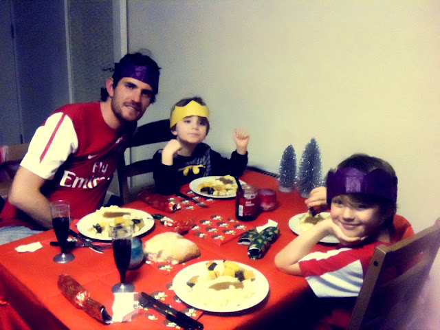 Had a really great first Christmas in England with my partner and boys. Ryan and I did not get a whole lot of sleep, but the smiles on the boys’ faces were so worth it! We dressed up and took a lot of photos. Thank you Bob Aherin & Sue Aherin for all the goodies and presents you sent. Best part was surprising our kids with the Indiana Jones themed room complete with a new loft bed. The boys spent the day playing with all of their new toys and gifts. They really enjoyed their new Arsenal football outfits and football fuzzy robes. Plus what is better than spending the day in our pajamas! Ryan made a really wonderful Christmas dinner and we had a blast with the Christmas crackers. Ready now to make up on the sleep we missed last night. Buon Natale to all my friends xx