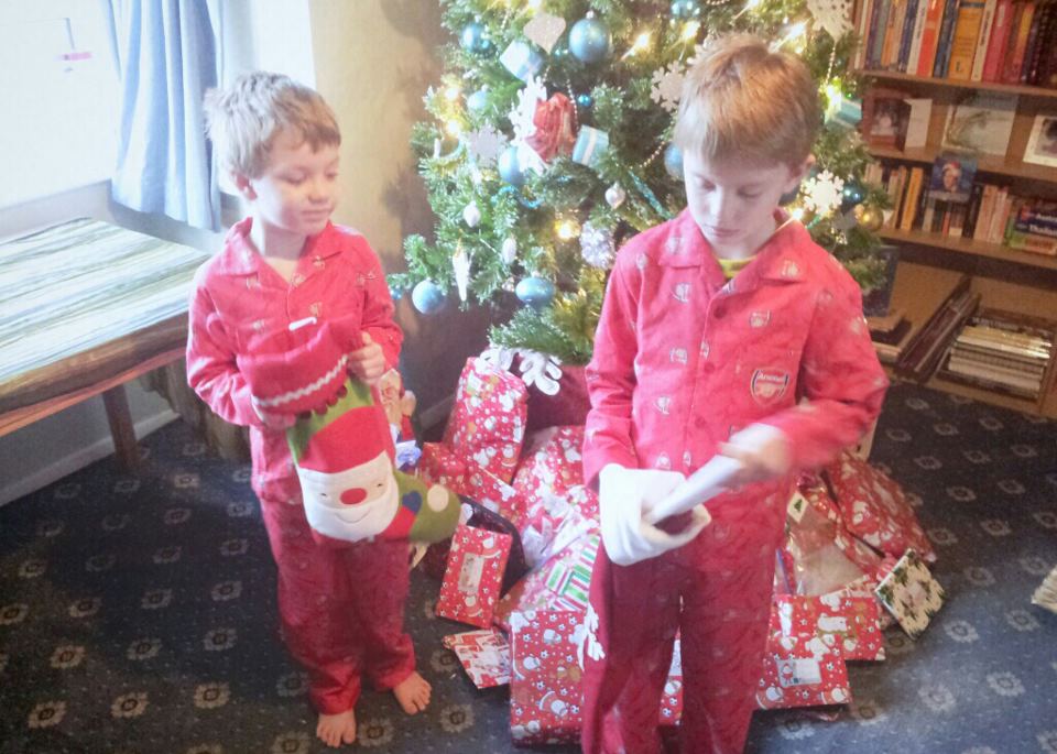 After getting their new Arsenal christmas pyjamas, the boys opened the stockings on Christmas morning that Nonna brought for us from the USA. |