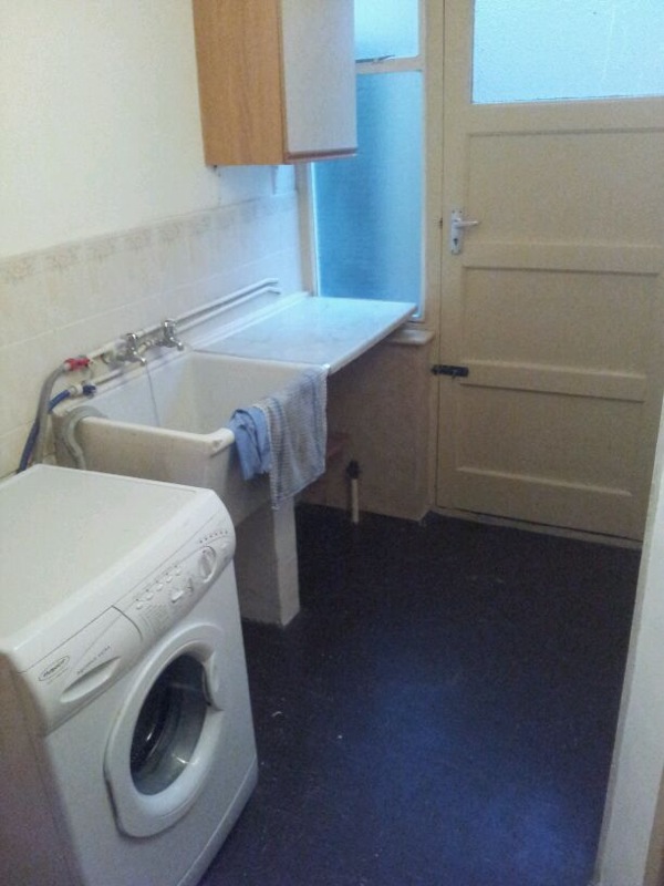 | This is our slightly bigger washing machine, does not dry, which drains into the utility sink. It shares a wall with our stove.