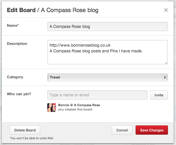 • Choose a username that matches your online personality.  If it is mainly personal use your name.  If you own a blog you could go with your blog name.  If you own a business create a business Pinterest account with your company’s name.