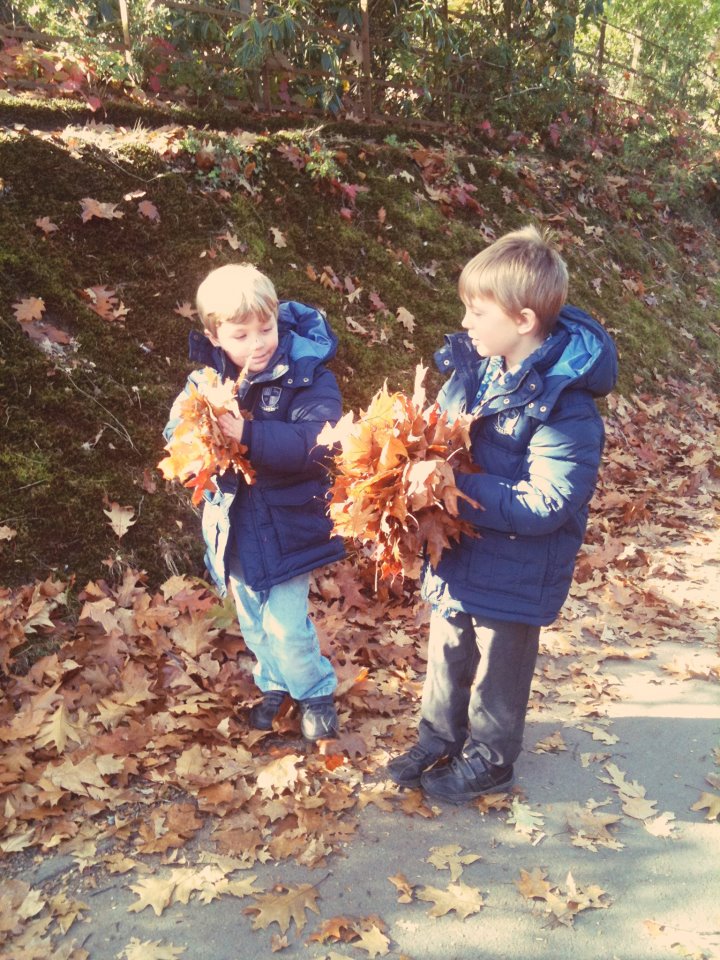 The boys and I have really been enjoying the Autumn season here in England.  After spending three years living in Hawaii and a brief stay in the desert in Arizona, having a real Autumn is a beautiful treat.  There is nothing like the changing of the leaves to make you aware that Summer is indeed over.  We have donned our heavier coats on colder days and sometimes find the need for wellingtons when its wet and dreary outside.  I have even coloured my hair (finally a ginger!) to go with the changing colours of the leaves.  Ronan has been assigned in school a project about the different trees and their leaves.  We have been collecting different leaves when we are outside and taking them home.  Tonight Ronan glued the best ones to his papers and worked like a sleuth to figure out what tree it originated from.   He loves investigating and has a keen appreciation for art and crafts, so this was a really fun project.  I have to be honest though.  I think what Ronan and Maddox love best is simply playing in all the fallen leaves.  Throwing them up in the air so they can rain down on them causes great big smiles and laughter is soon to follow as we crunch the leaves with our feet as we walk through a dense pile on the ground.  Summer is a lovely and much awaited season, but with the arrival of Fall it does not mean an End.  It is simply a beginning to the cooler seasons and means that Winter and the Holidays are fast approaching.