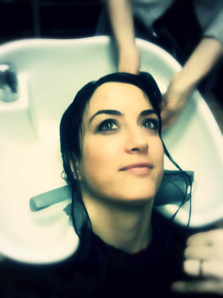 Here I am at my place of work during my day off.  Why you ask? Well to be fair, even though I am a hair designer it is not easy to get my own hair done.  Besides finding a time I can come in on my day off, finding another stylist with the same free time is hard to come by.  So whenever I hear one of the trainees mention they are at a loss for a model for an upcoming class I volunteer.  Today Emma gave me a much needed trim and refreshed my colour with PM Shines, a demi permanent conditioning colour. Thank you Emma! xx