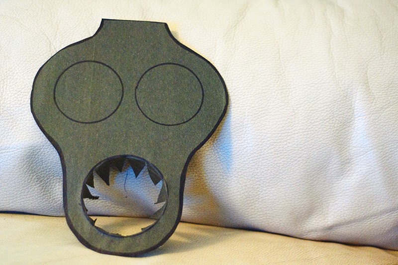 I glued the inside of the file to make the gas mask extra sturdy. I drew out the shape of it from hand and used the cadbury can to make three circles for the eyes and mouth. All three will need to be cut out but I recommend cutting the mouth as show with ‘teeth’ so that it can attach well to the can.