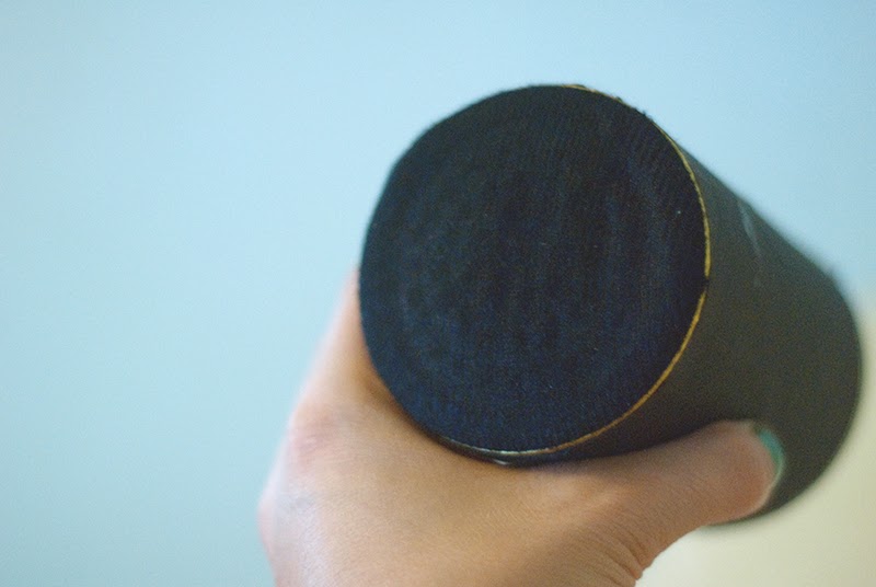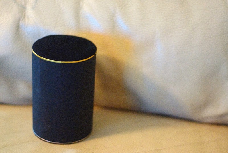 I covered the can with black scrapbooking paper and left the gold metal rim that came on the cadbury tin. Seemed like a perfect detail for an accent piece.