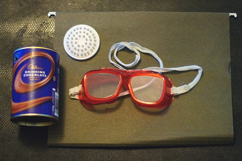 Gather Your Supplies. I found a file, some kid science goggles, a cadbury tin, a shower head, and other items just from what we had in the house. I did not spend any extra money to make this cosplay item.