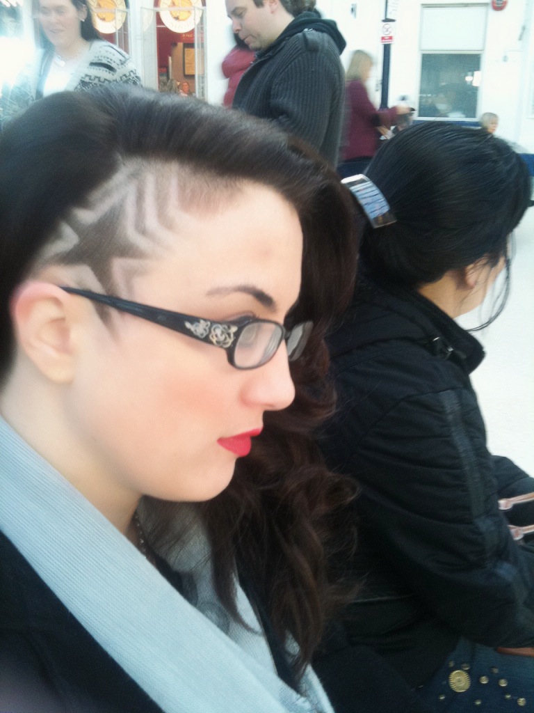 I already shaved the side of my head myself.  This was for one of the things to do before I turn 30 this year.  Being such a big milestone marker in birthdays I want to do a bunch of things I have not done yet or would like to accomplish before November 24th rolls around.  I love the shaved side of my head because I can show it off or keep it hidden.  But I really wanted to do something more fun with it.  So after being a hair model for my coworker Claire at the Brighton salon, I popped into a barber shop by the rail station.  I asked for a star design that I had seen online and got a great end result.  It was so much fun to show off as I waited for my train.  I have to admit that hanging out at the barber shop with a bunch of guys is very refreshing from working in a salon with mostly females every day.  I think I will go back once this design grows out.
