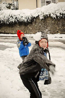 After going to bed knowing there would be much more snow on the ground, we were all quite excited to wake up and play in it.  The boys and I got dressed for the snow and then headed out to get breakfast on the way and a sledge (a sled in the US).  We went to the football park nestled in the middle of the town where there were quite a bit of inclines perfect for sledging.  We   had fun also making snowman, throwing snowballs, and making snow angels.  Ryan came and met us after work and by the time we went back home we had been in the snow for three hours!  I love being in the snow and I was pleasantly surprised to find the snow was so perfect for so many snowy activities.  The boys were very eager to get some hot cocoa back on the way home and talk about all the fun they had in the snow.  It was a great way to finish up the weekend.