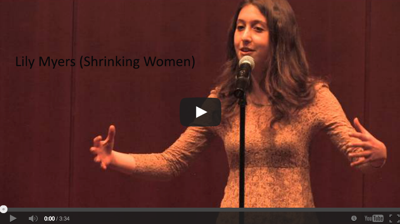 I have gotten a really great response from you all about my War on Girl series.  So when I saw this video on Upworthy today I knew I had to share it here on the blog. It expresses so beautiful in the use of poem form the pressure we as women feel to take up less space in the world.  This does not start as women, this begins as girls as we watch the woman around us.  I cannot say more about this because the video speaks volumes.  Meet Lily Myers whose poetry slam ‘Shrinking Women‘ won Best Love Poem at the 2013 College Unions Poetry Slam Invitational in April.